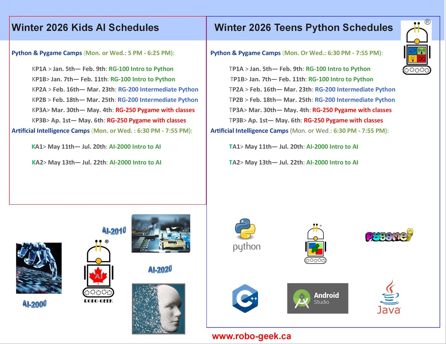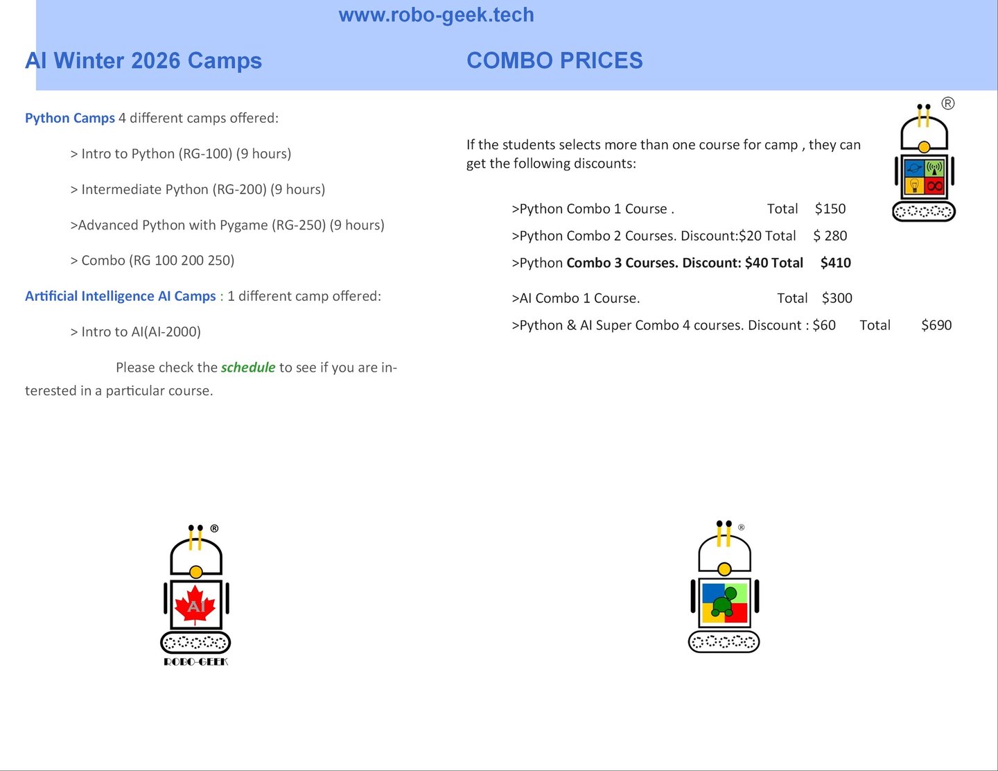 This Winter, Robo-Geek is thrilled to launch cutting-edge online AI-STEM courses designed to empower kids and teens across Canada. Our camps are built to ignite curiosity, foster critical thinking, and equip young learners with practical Artificial Intelligence and coding skills using Python.